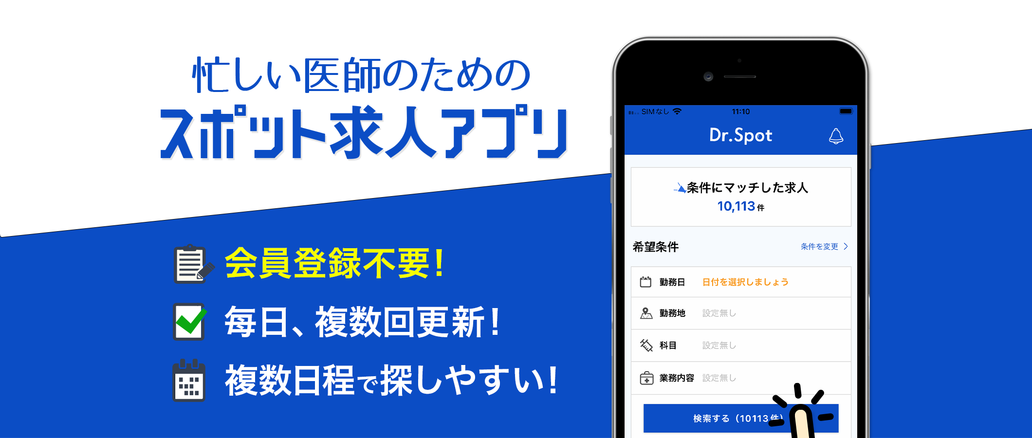 Dr.Spot(ドクタースポット)は、医師のスポットバイト専用の求人検索アプリ・Webメディアサイトです。